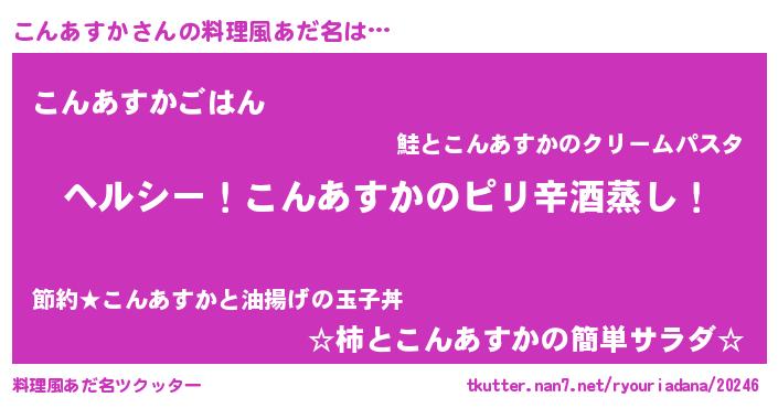 | 男性向けラノベタイトル風あだ名 | 『Re:こんあすかから始める異世界生活』 |