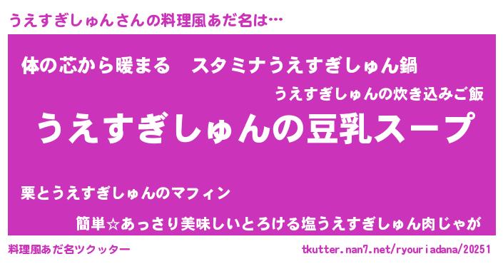 | 女子向けラノベタイトル風あだ名 | 『うえすぎしゅんは平凡を望む』 |