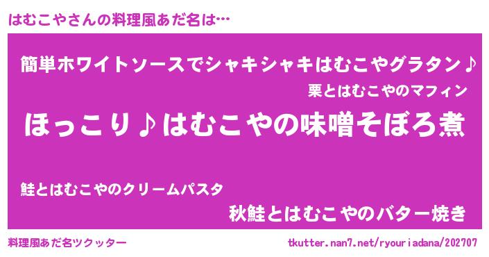 | 女子向けラノベタイトル風あだ名 | 『(仮)はむこやのやんごとなき事情』 |