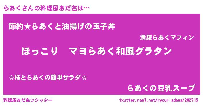 | 男性向けラノベタイトル風あだ名 | 『この素晴らしい世界にらあくを!』 |