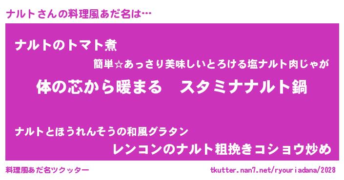 | 女子向けラノベタイトル風あだ名 | 『ナルトの雑貨屋さん』 |