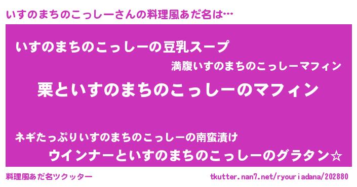 | 胡散臭い通販商品みたいなあだ名 | 『信頼と実績のサプリメント…その名も「いすのまちのこっしー」』 |