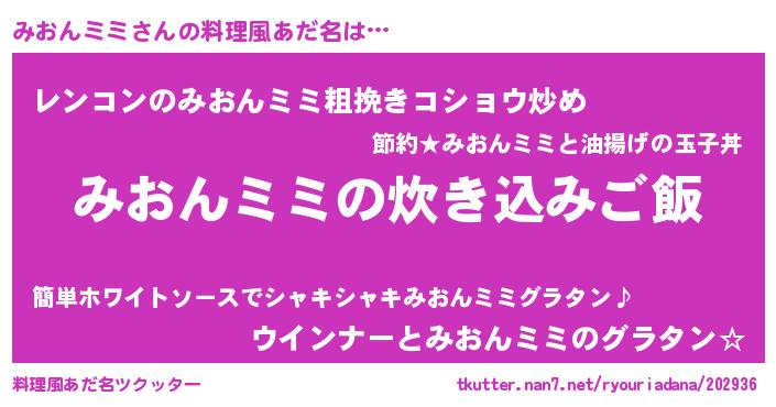 | 胡散臭い通販商品みたいなあだ名 | 『テレビで話題のアガリクス…その名も「みおんミミ」』 |