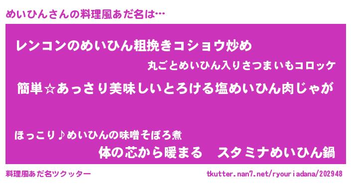 | 意味不明あだ名 | 『永久保存めいひん』『自称めいひん』 |