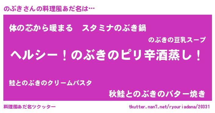 | 女子向けラノベタイトル風あだ名 | 『闇ののぶき』『のぶきの雑貨屋さん』 |