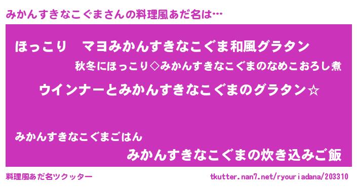 | 欧米人風あだ名 | 『みかんすきなこぐまクリステル』 |