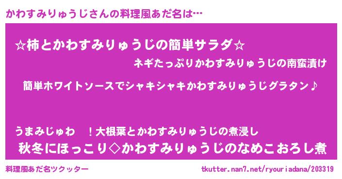 | 男性向けラノベタイトル風あだ名 | 『かわすみりゅうじの嫁は女の子じゃないと思った?』 |