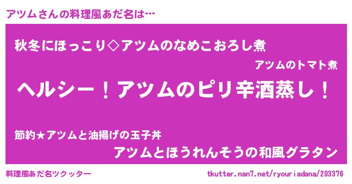 | 男性向けラノベタイトル風あだ名 | 『Re:アツムから始める異世界生活』 |