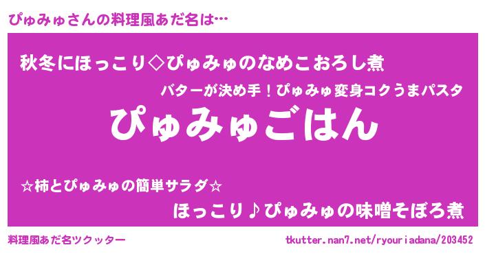 | 男性向けラノベタイトル風あだ名 | 『ピュミュスレイヤー』『ぴゅみゅの憂鬱』 |
