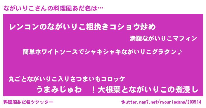 | 男性向けラノベタイトル風あだ名 | 『ながいりこの嫁は女の子じゃないと思った?』 |