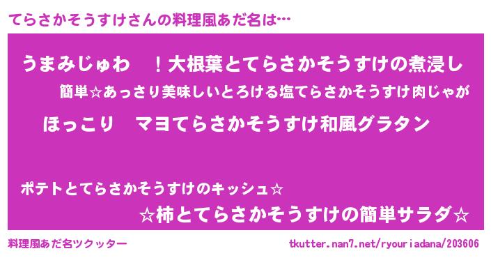 | 男性向けラノベタイトル風あだ名 | 『この素晴らしい世界にてらさかそうすけを!』 |