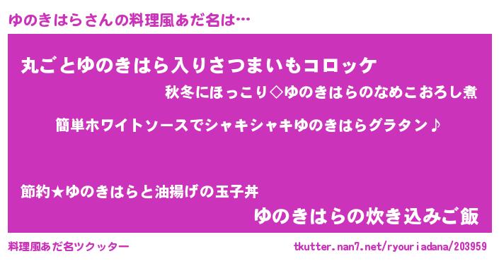 | 男性向けラノベタイトル風あだ名 | 『ゆのきはらの嫁は女の子じゃないと思った?』 |