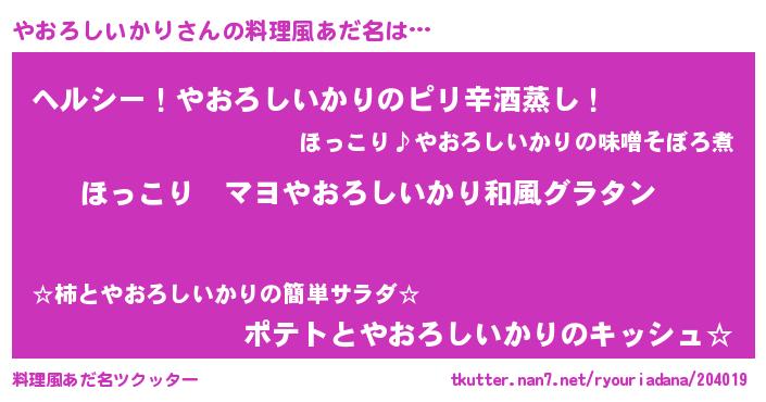 | 意味不明あだ名 | 『住所不定無職やおろしいかり(11歳)』 |