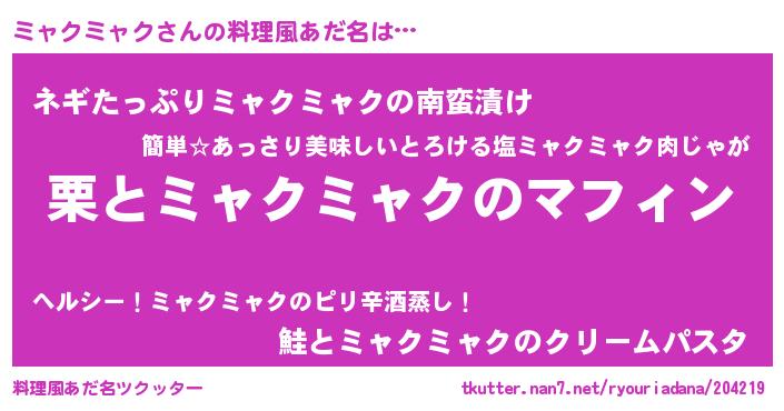 | ヘコむあだ名 | 『ミャふぇ~』『ミャクミャク(小並感)』 |