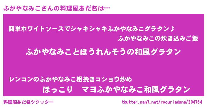 | ポケモン風あだ名 | 『フカキング』『ヒフカヤナミコ』 |