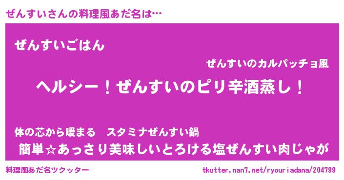 | 男性向けラノベタイトル風あだ名 | 『Re:ぜんすいから始める異世界生活』 |