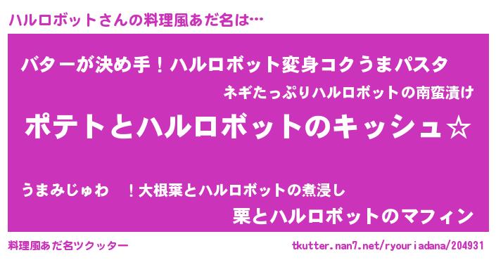 | 男性向けラノベタイトル風あだ名 | 『ハルロボットの嫁は女の子じゃないと思った?』 |