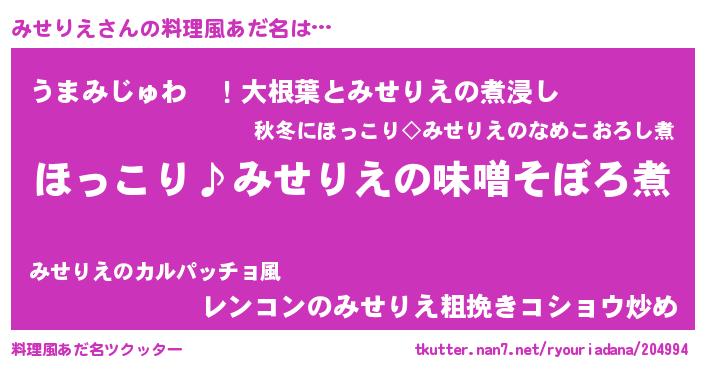 | 男性向けラノベタイトル風あだ名 | 『みせりえの憂鬱』『魔弾の王とみせりえ』 |