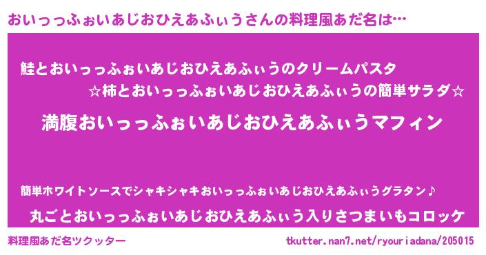 | 胡散臭い通販商品みたいなあだ名 | 『絶対に幸福をもたらす水素水…その名も「おいっっふぉいあじおひえあふぃう」』 |