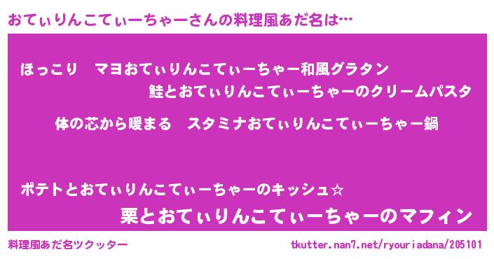 | 女子向けラノベタイトル風あだ名 | 『おてぃりんこてぃーちゃーの雑貨屋さん』 |