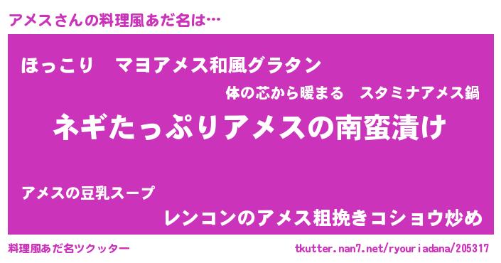 | ポケモン風あだ名 | 『アメチュウ』『アーメイ』 |