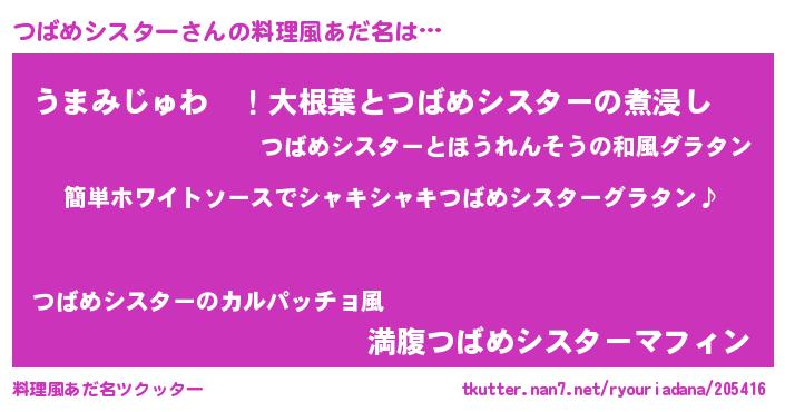 | 男性向けラノベタイトル風あだ名 | 『つばめシスターの嫁は女の子じゃないと思った?』 |