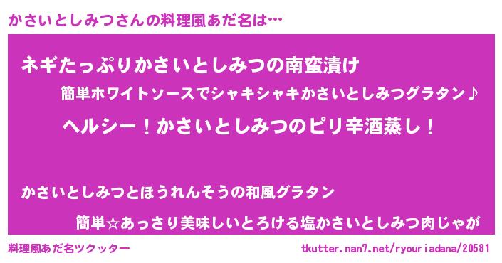 | 男性向けラノベタイトル風あだ名 | 『Re:かさいとしみつから始める異世界生活』 |