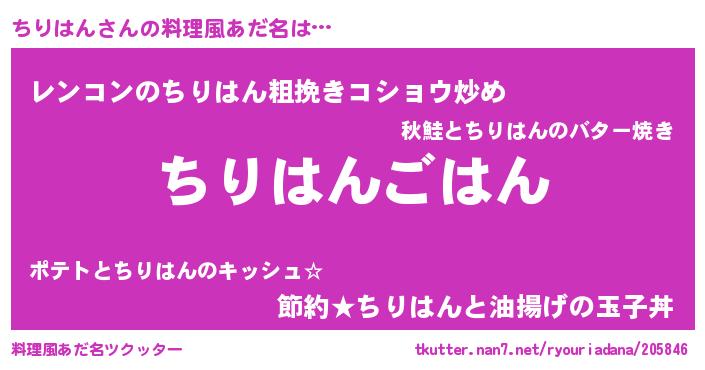 | 男性向けラノベタイトル風あだ名 | 『チリハンスレイヤー』 |