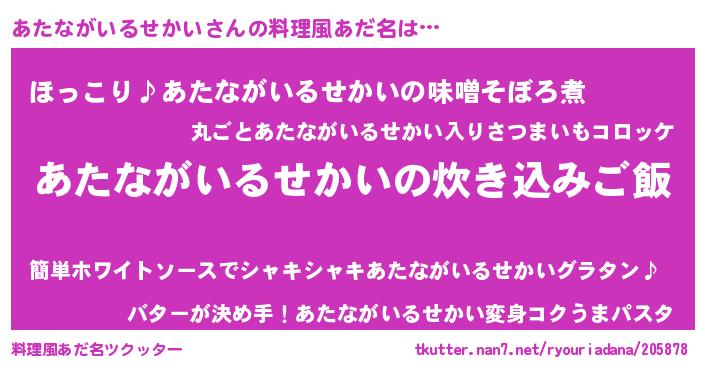 | 胡散臭い通販商品みたいなあだ名 | 『億万長者になれるブレスレット…その名も「あたながいるせかい」』 |
