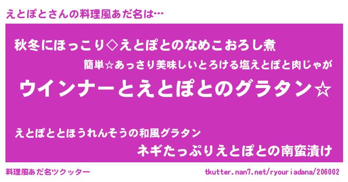 | 男性向けラノベタイトル風あだ名 | 『やはりえとぽとの青春ラブコメはまちがっている 』 |