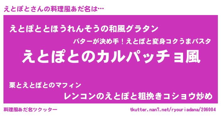 | 意味不明あだ名 | 『住所不定無職えとぽと(9歳)』 |