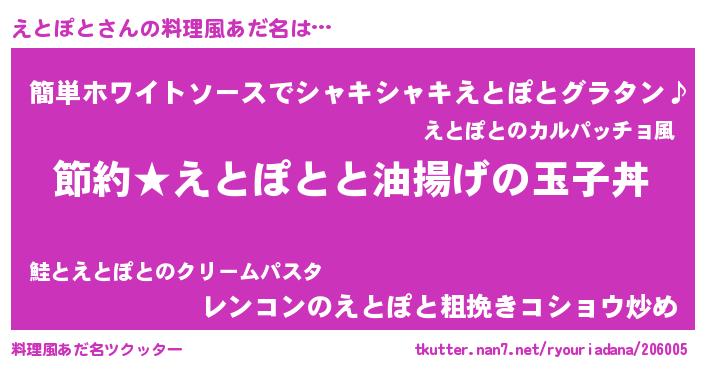 | 男性向けラノベタイトル風あだ名 | 『えとぽとの憂鬱』『魔弾の王とえとぽと』 |