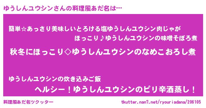 | 男性向けラノベタイトル風あだ名 | 『ゆうしんユウシンに滅ぼされるだけの簡単なお仕事です』 |