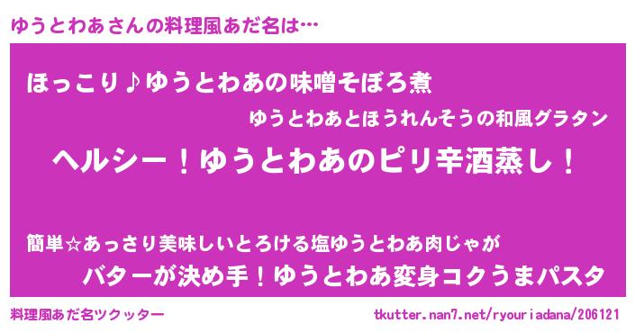 | 男性向けラノベタイトル風あだ名 | 『Re:ゆうとわあから始める異世界生活』 |