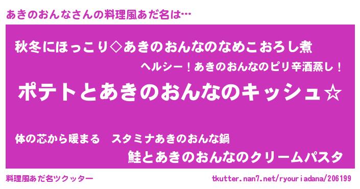 | 男性向けラノベタイトル風あだ名 | 『あきのおんなの嫁は女の子じゃないと思った?』 |