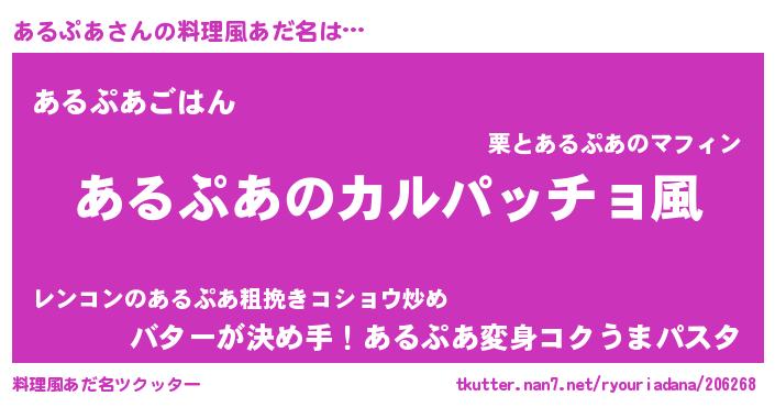 | 女子向けラノベタイトル風あだ名 | 『あるぷあが死なない童話 林檎のあるぷあの診療簿』 |