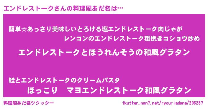 | 胡散臭い通販商品みたいなあだ名 | 『来世でも幸せになれる健康食品…その名も「エンドレストーク」』 |