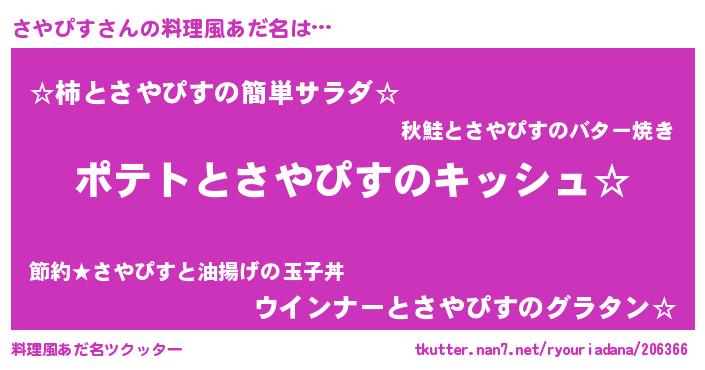 女子向けラノベタイトル風あだ名 | 『さやぴすの卵を拾いまして』 |