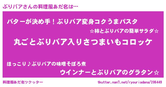 | 男性向けラノベタイトル風あだ名 | 『この素晴らしい世界にぶりバアを!』 |
