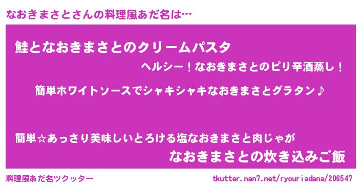 | 男性向けラノベタイトル風あだ名 | 『なおきまさとの嫁は女の子じゃないと思った?』 |