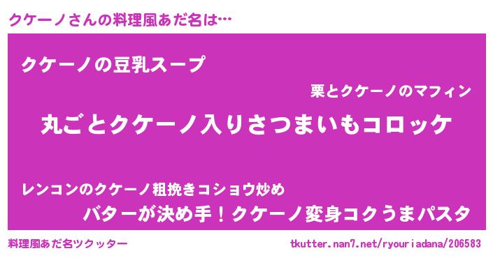 | 女子向けラノベタイトル風あだ名 | 『乙女ゲームの破滅フラグしかない悪役クケーノに転生してしまった…』 |