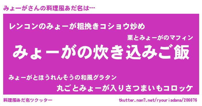 | 男性向けラノベタイトル風あだ名 | 『うちのみょーがが世界を掌握している!』 |
