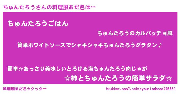 男性向けラノベタイトル風あだ名 | 『ちゅんたろうの嫁は女の子じゃないと思った?』 |