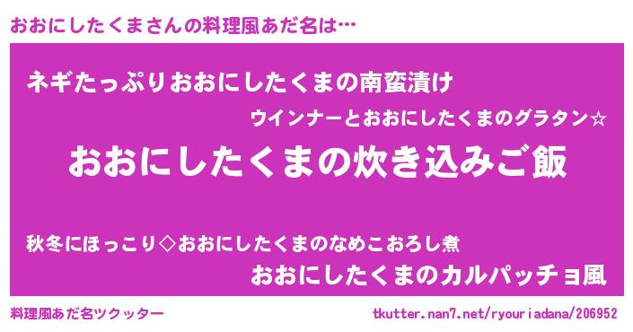 男性向けラノベタイトル風あだ名 | 『うちのおおにしたくまが世界を掌握している!』 |