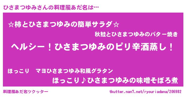 | 男性向けラノベタイトル風あだ名 | 『Re:ひさまつゆみから始める異世界生活』 |
