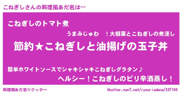女子向けラノベタイトル風あだ名 | 『こねぎし姫と円卓の騎士』 |