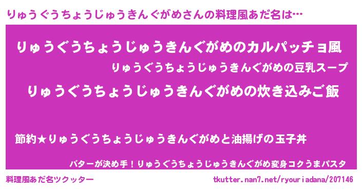 男性向けラノベタイトル風あだ名 | 『うちのりゅうぐうちょうじゅうきんぐがめが世界を掌握している!』 |
