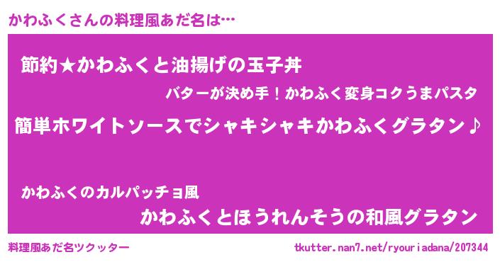| 女子向けラノベタイトル風あだ名 | 『かわふく様がみてる』『かわふく恋絵巻』 |