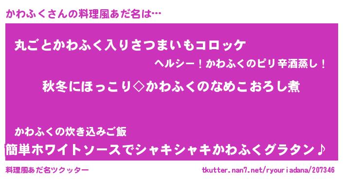 | 男性向けラノベタイトル風あだ名 | 『かわふくに滅ぼされるだけの簡単なお仕事です』 |