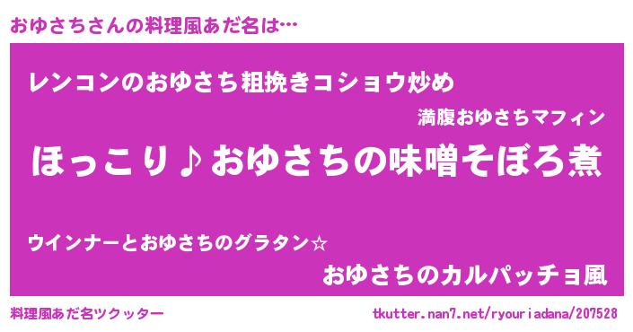 | 男性向けラノベタイトル風あだ名 | 『おゆさちの憂鬱』『魔弾の王とおゆさち』 |